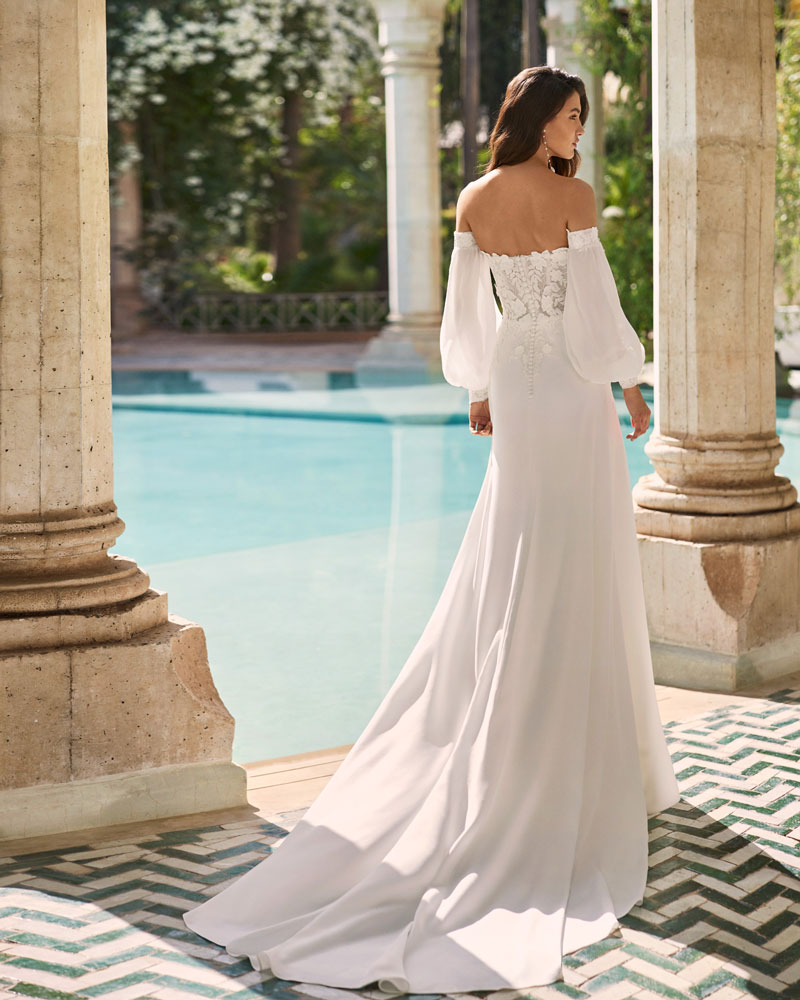 An effortless design that is gorgeous for any wedding venue. This simple and fluid A-line gown by Adriana Alier is crafted with soft crepe and delicate lace details, featuring a strapless sweetheart neckline and dreamy detachable georgette sleeves for two looks in one. It is perfect for transitioning from ceremony to reception.