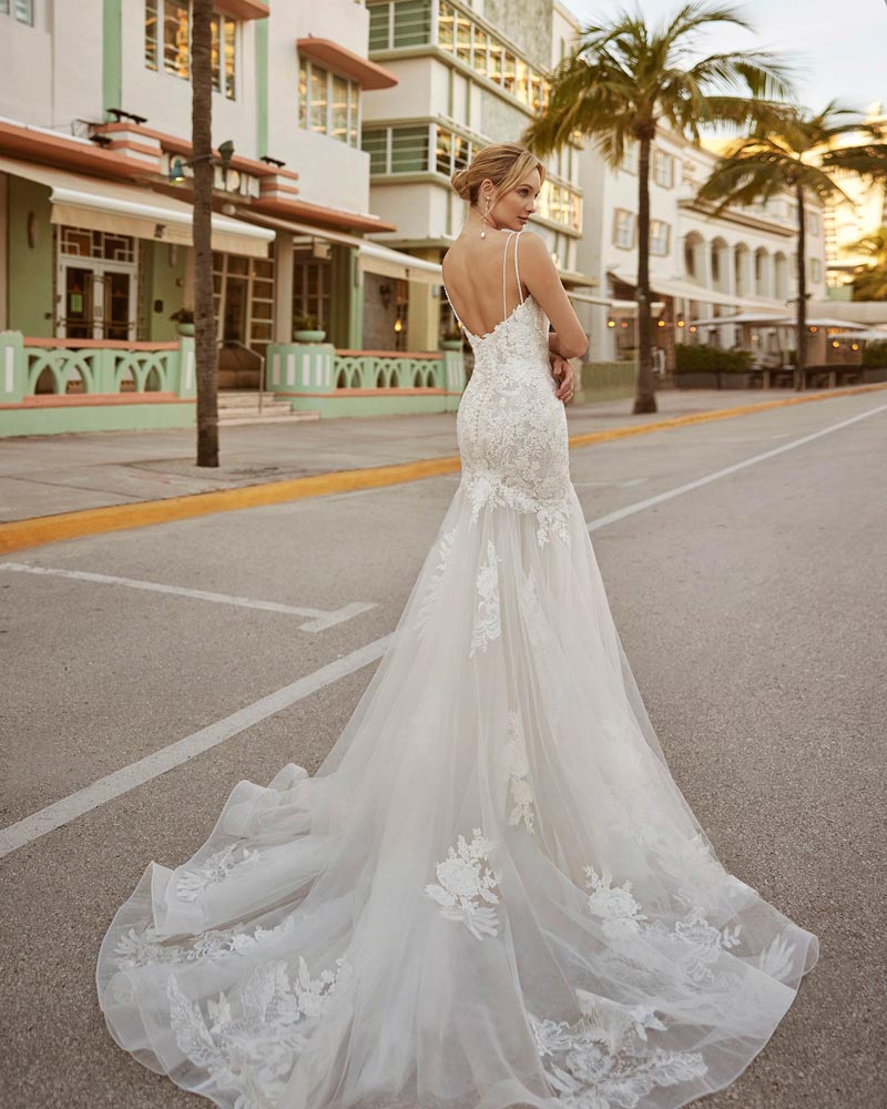 Cata is a sexy mermaid style wedding dress made in lace and shimmering beadwork. This glamorous Luna Novias design features a V-neckline, open back and delicate straps.