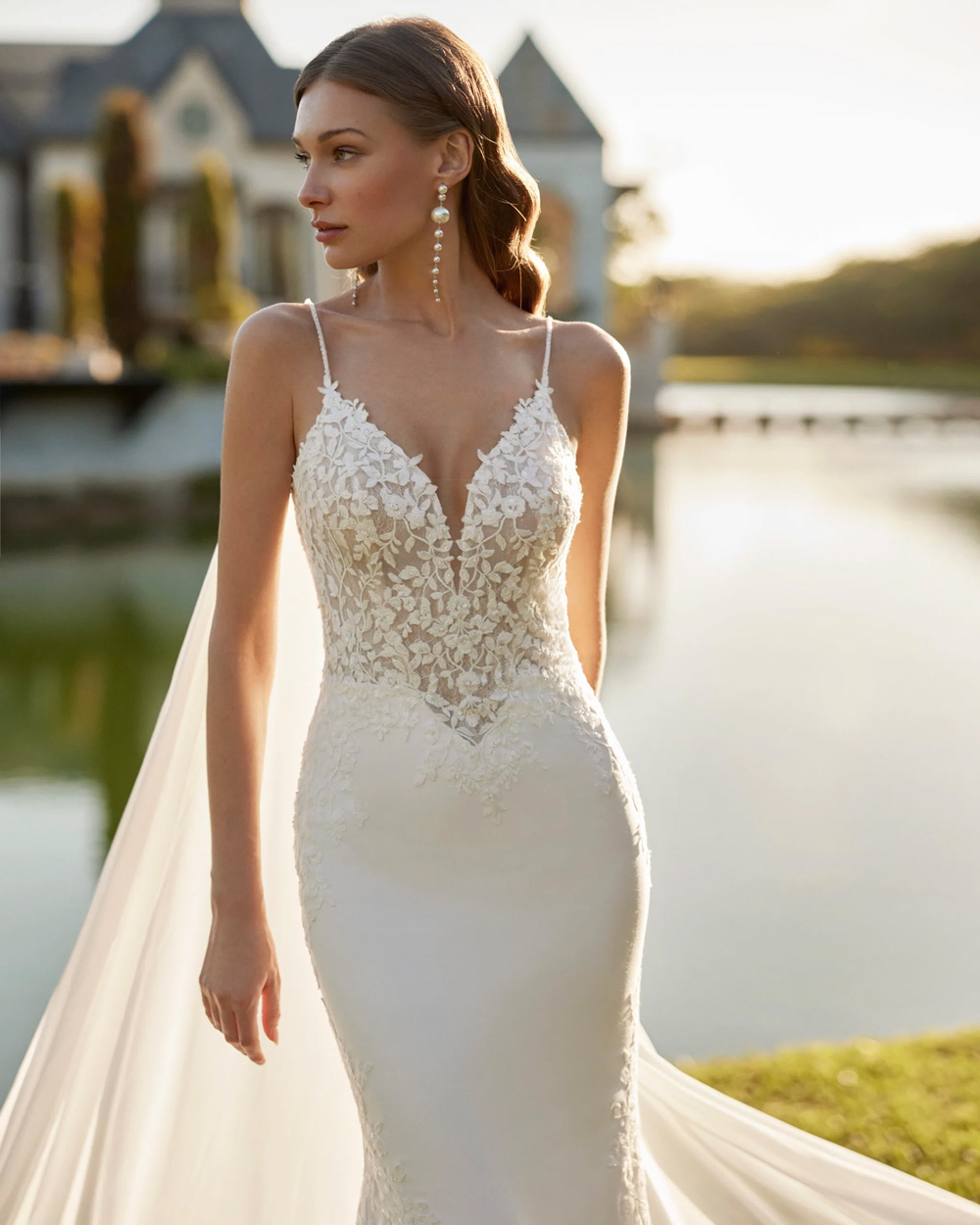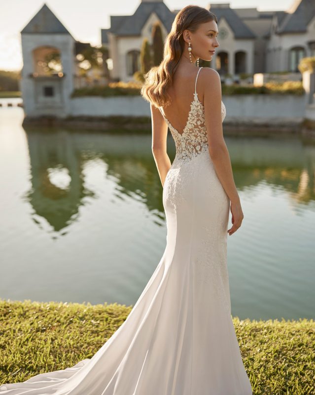 Elita is a sexy two-piece mermaid wedding dress. crafted in comfortable stretch crepe combined with intricate lace and beadwork. Sparkle in this Rosa Clará bridal design, featuring a plunging neckline, V-back and a detachable flowing georgette cape.