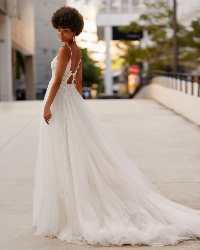 Another beautiful Boho, princess-style A-line wedding dress, crafted in tulle embellished with lace and beadwork. All eyes will be drawn to this dreamy Rosa Clará Soft design, featuring a front V-neckline and a round keyhole back. It also has delicate beaded straps and skirt with a side slit.