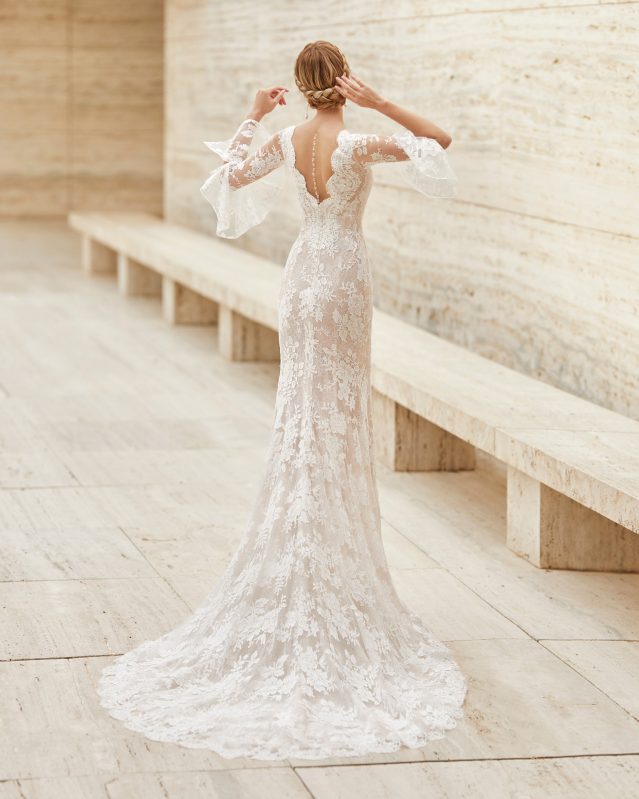 The deep V front draws the eye towards a playful slit at the front, which helps elongate the legs and provide a dash of frivolity. A mermaid cut hugs the figure and beaded lace sleeves complete the Rosa Clara Couture look.